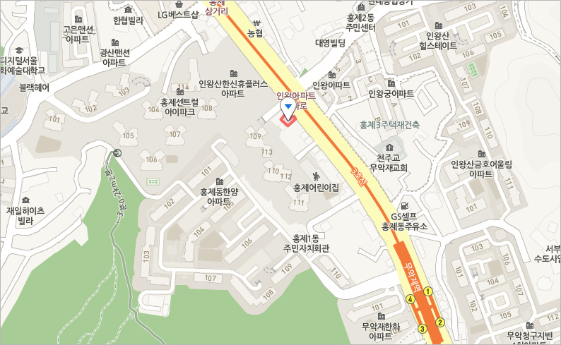 - 서울 지하철 3호선 무악재역 4번출구 아이파크 아파트 입구 바로 옆 / 홍제역에서 하차시 무악재역 방향